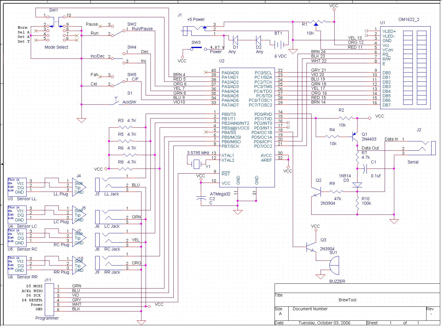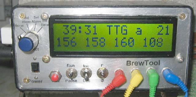 The BrewTool is a combination timer and thermometer. The timer provides for 26 alarms over a time range from 0 to 999 minutes (16+ hours). The thermometer supports up to four temperature sensors. The settings for the alarms are retained in EEPROM when the unit is powered down. A photo of the front panel is shown below: