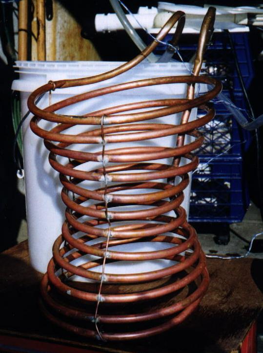 This is a photo of the “hourglass” shaped chiller I use. It is shaped this way because it was easiest to make. I also believe that is cools better than the cylindrical type because it is better distributed throughout the wort. To improve efficiency, I jog it up and down 3 or 4 times every 2-3 minutes.